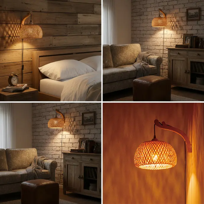 La pantalla redonda de mimbre en doble capa (Ø28 cm) permite que la luz se filtre suavemente, generando un efecto cálido y envolvente. La estructura mural en madera aporta carácter y estabilidad, convirtiéndolo en un elemento decorativo incluso cuando está apagado.