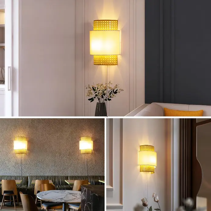 El aplique de pared BAMBINA combina el ratán con la suavidad de una pantalla de tela blanca, dando como resultado una pieza decorativa acogedora y elegante, ideal para aportar luz ambiental y estilo a espacios interiores.